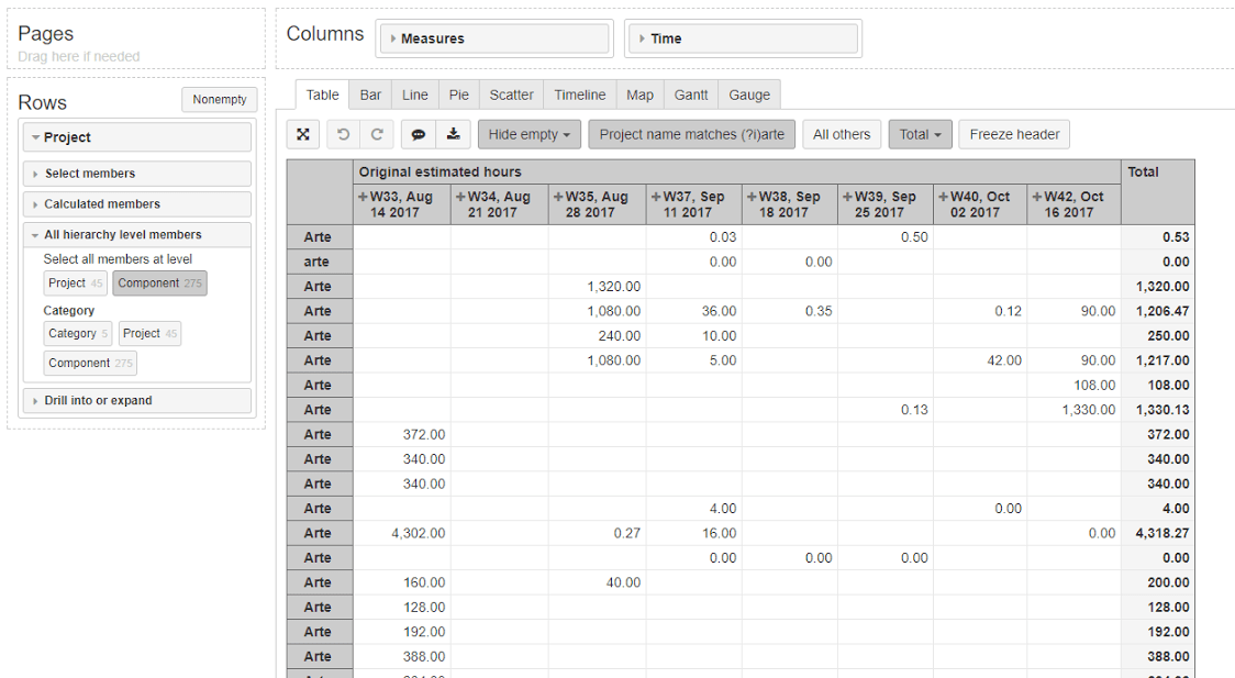 In the screenshot example, we can see a lot of components from all projects called “Arte” or “arte”, to know the Estimated time by week by component (in this case the component is shared between projects and for this reason we must aggregate them).