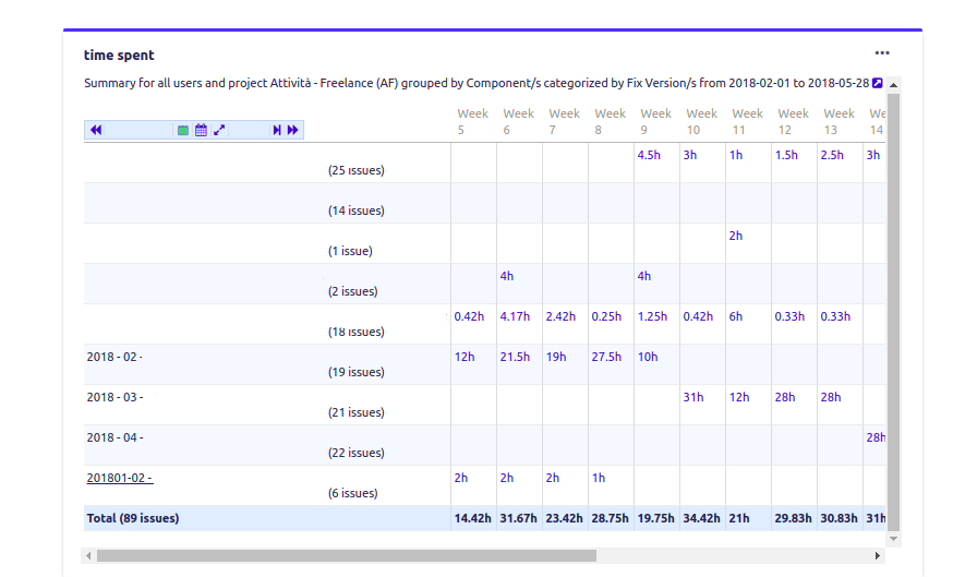 where it’s possible see all the time spent grouped by (in this sample) Component/s field but it’s possible choose anything you need.