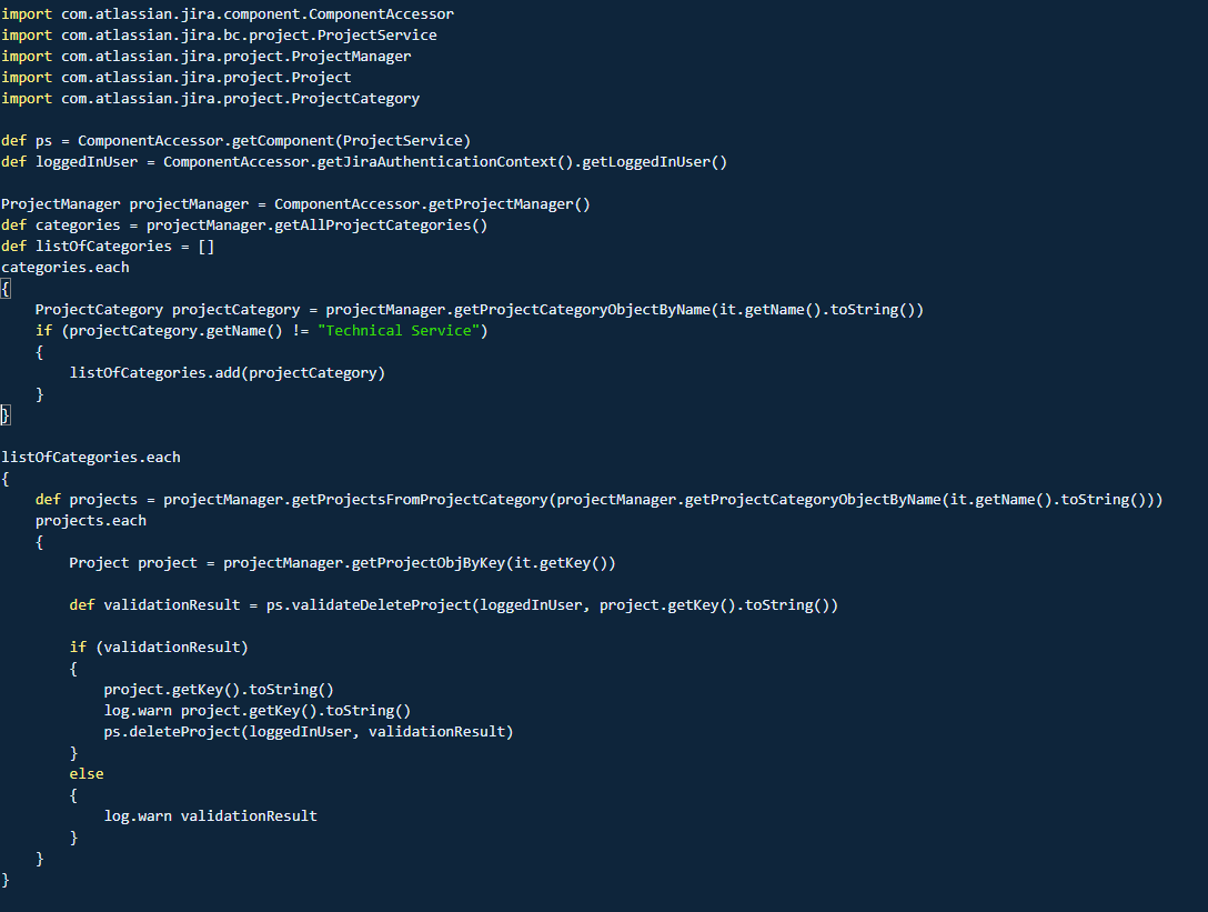 Sometimes, migration time is time for clean our database…if you want to remove some projects with an automation, the following code shows you to do it according to Jira Category field.