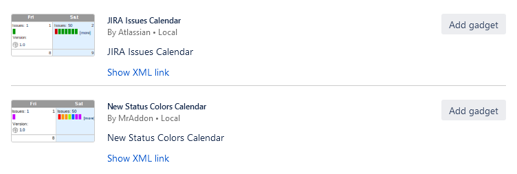 left picture: New Status Colors Calendar gadget , right picture: Atlassian Jira Issues Calendar gadget
