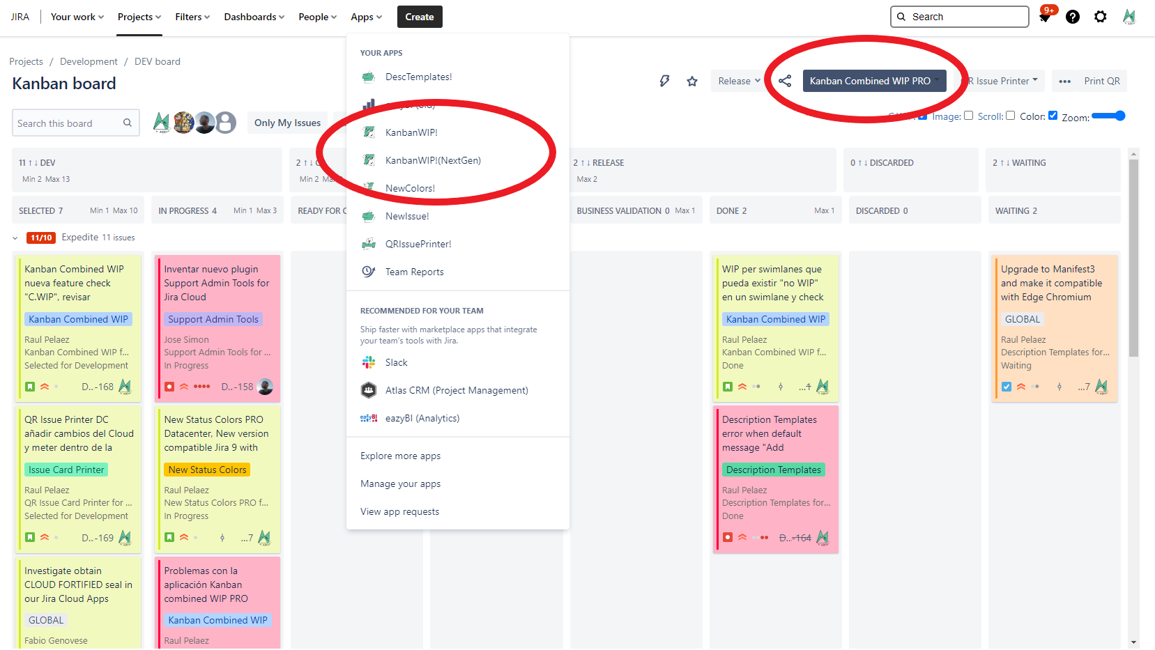 For this reason you will see in the new version of Kanban Combined WIP for Jira Cloud plugin two options (in Apps menu, or in your Kanban boards, button “Kanban Combined WIP PRO“).