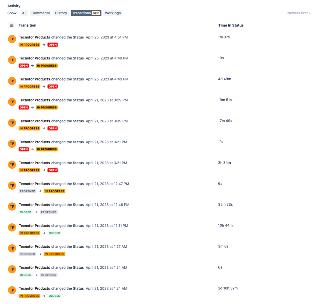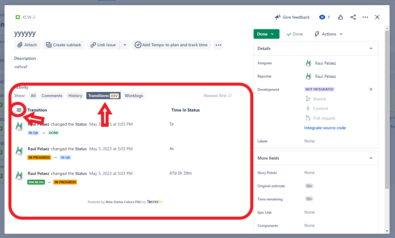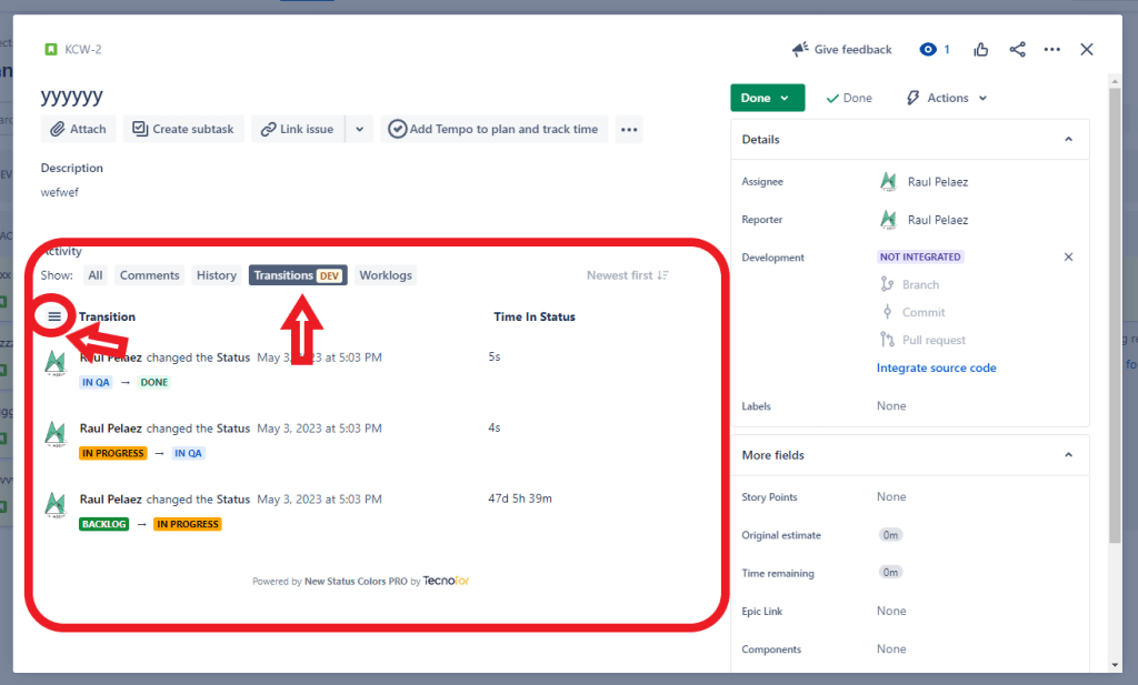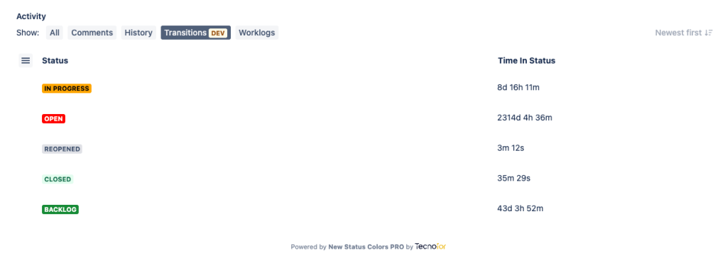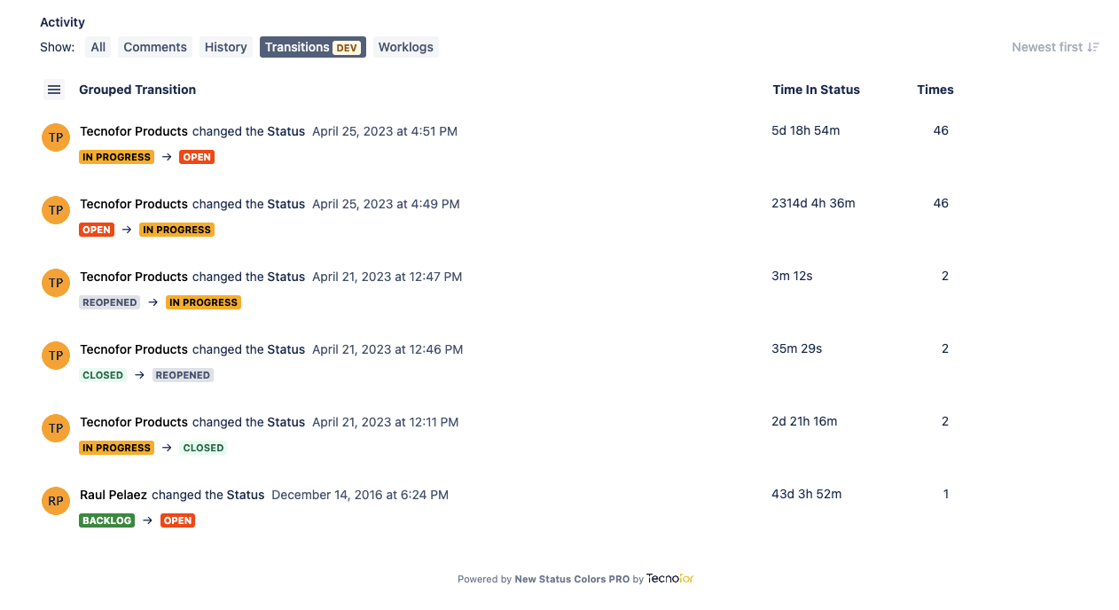With these new superpowers you will be able to see all the information you need within the Issues: A Transitions panel to track and audit ticket transitions, another panel with the most relevant Transitions and a last panel with the time spent grouped by status (Time in status). In addition, you will see the statuses in full color if your browser extension is activated!