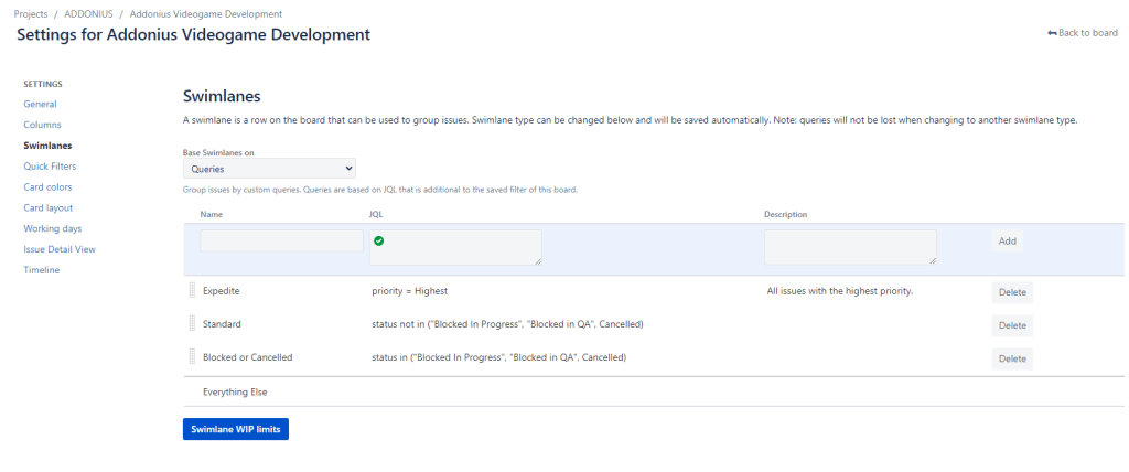 2. Set up swimlanes for each CoS category on your Kanban board. Go to the board configuration in Jira and create swimlanes for each CoS category identified in step 1. Additionally, create a swimlane specifically for blocked tasks (is my personal recommendation, “Blocked” is not a Class of Service class but I love to see blocked tasks in a separate swimlane)