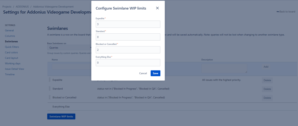 5. Set Work in Progress (WIP) limits per swimlane if needed. To maintain a balanced workflow and prevent overload, you can set specific WIP limits for each swimlane based on the CoS category. This helps teams focus on high-priority tasks and manage their workload effectively.