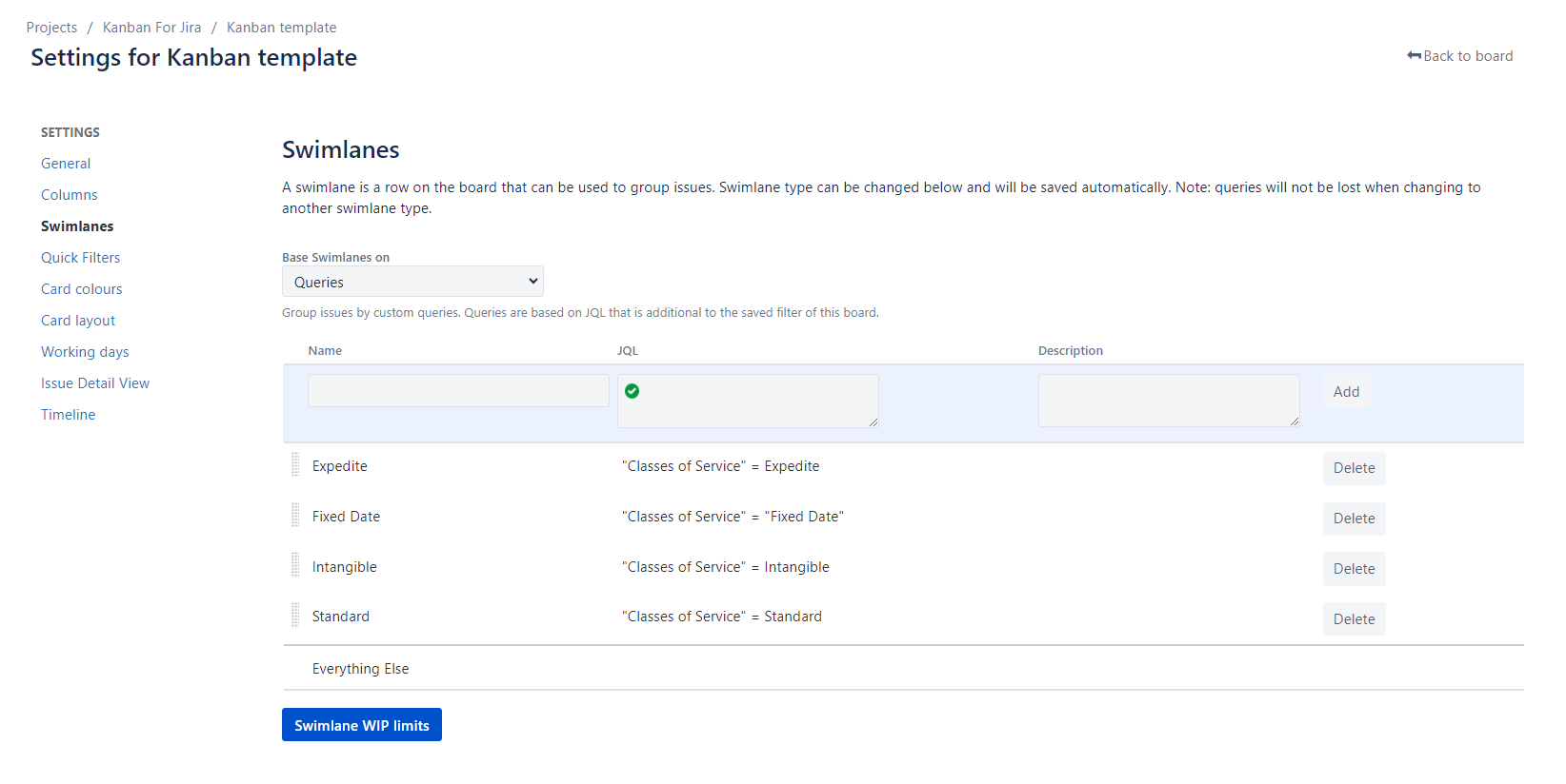 2. Set up swimlanes for each CoS category on your Kanban board. Go to the board configuration in Jira and create swimlanes for each CoS category identified in step 1. Additionally, create a swimlane specifically for blocked tasks (is my personal recommendation, “Blocked” is not a Class of Service class but I love to see blocked tasks in a separate swimlane)