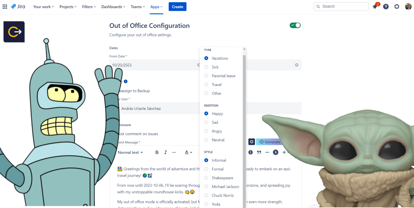 Armed with the powerful wizardry of OpenAI, we sprinkled the magic dust of creativity and personalized pizzazz into our out-of-office messages. Picture Shakira 🎤, Yoda 🌟, Michael Jackson 🕺, Mary Poppins ☂️, and even Chuck Norris 🥋 collaboratively crafting your witty, yet professional, absence notes. (We can’t promise Chuck Norris won’t add a touch of his legendary toughness!) 💫