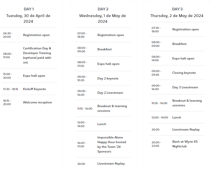 Networking opportunities, interactive labs and hands-on training, a buzzing expo floor, show-stopping keynotes, and more. There’s something for everyone during 3 full days of Team ’24.