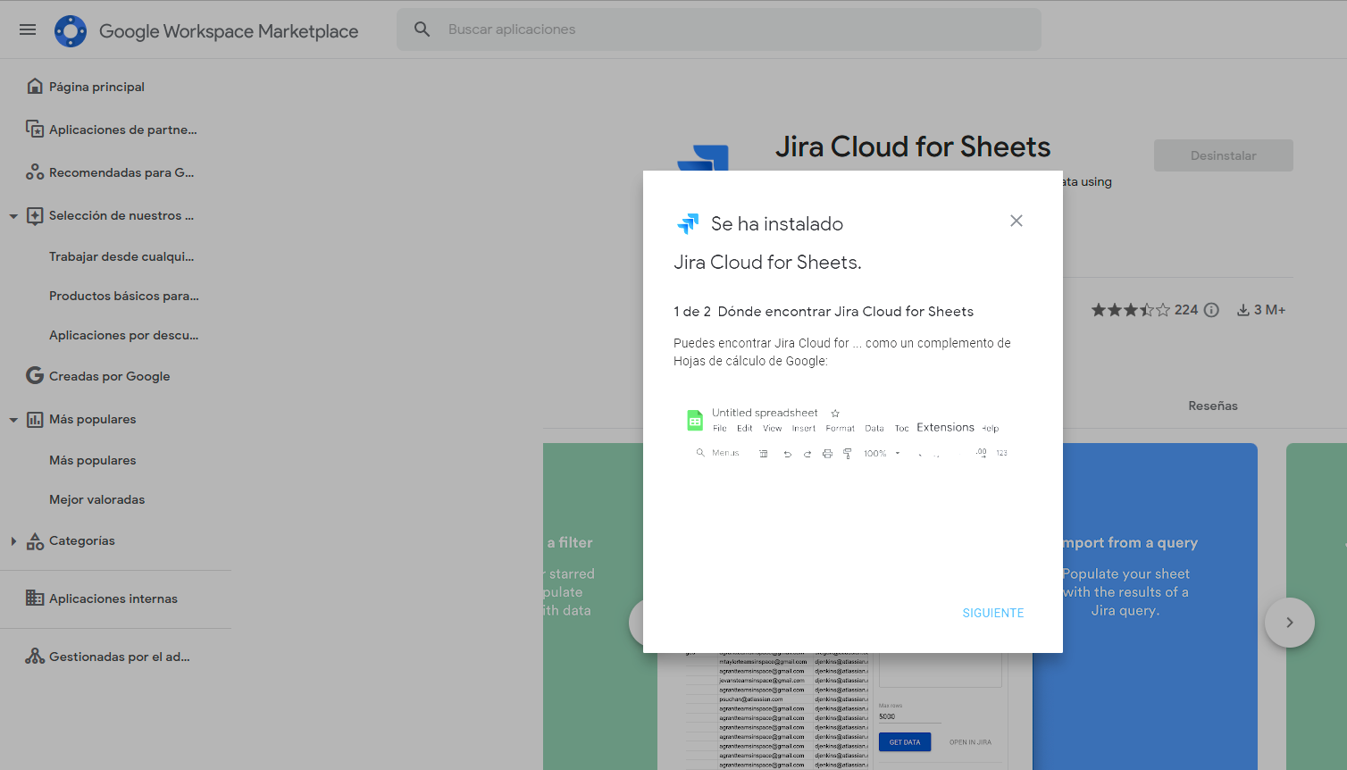 - Find “Jira Cloud for Google Sheets” – should be there if your admin did their job
