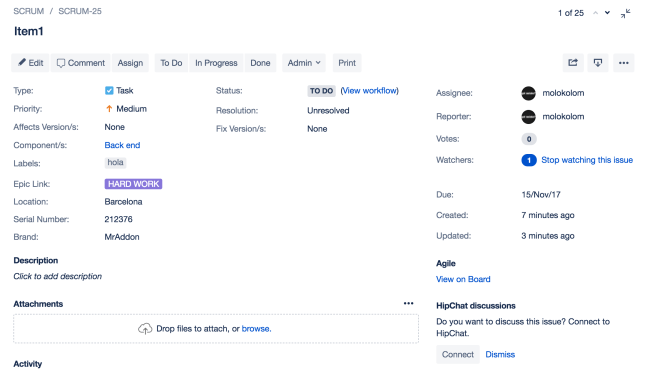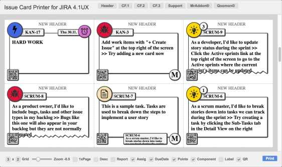 With this JIRA add-on you can take more advantages in your Agile processes. This add-on was created to synchronize the physical board with the computer board (JIRA Rapidboard) through the print of the issues transformed in beautiful cards (to stick it in the real board.) To allow this (the possibility to print the issues as cards with beautiful layouts), you only need to install the Issue Card Printer add-on in your JIRA. The code is based in the awesome Github repository of Bengt Brodersen from Qoomon.