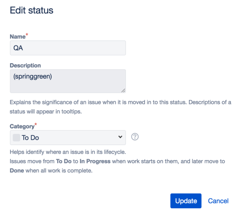 1. Configure it! Click in the “cog icon” and select “Issues”, then in the section “Issue Attributes” click on “Statuses”
